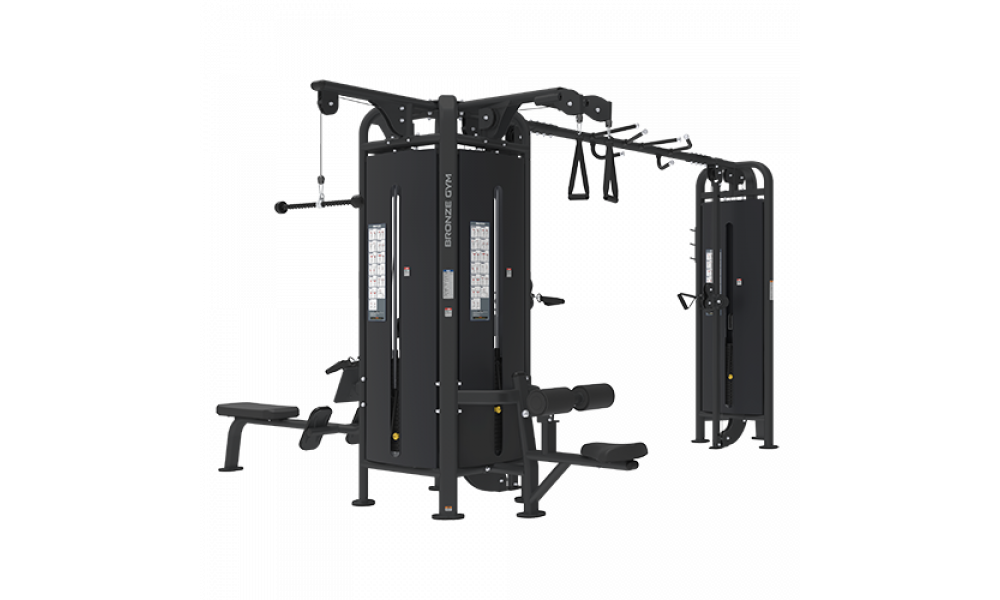 5-ти позиционная профессиональная мультистанция BRONZE GYM MS-1003 – эффективный профессиональный силовой тренажер, предназначенный для коммерческого использования, который позволяет комплексно прорабатывать все тело, обеспечивая отличный уровень атлетической подготовки. Тренажер включает в себя 2 станции для тяги сверху, станцию для гребной тяги, и две кабельные колонны, что позволяет одновременно заниматься на тренажере до пяти пользователей. Передача нагрузки осуществляется с помощью тросово-блочной системы, в которой используется прочный трос толщиной 6 мм. Широкая рамная конструкция способствует дополнительной стабильности, обеспечивает равномерное распределение нагрузки исключая раскачивание и вибрацию. Двойные тяговые колонны позволяют выполнять упражнения как двумя руками, так и одной. Вращающиеся рукояти обеспечивают свободные и естественные движения. На верхней перекладине предусмотрен турник, рукоятки которого позволяют выполнять подтягивания широким, нейтральным и узким хватом, акцентируя нагрузку на необходимые группы мышц. Конструкция мультистанции MS-1003 включает 5 грузовых стеков общим весом 414 кг. Удобный выбор нагрузки осуществляется с помощью штифтов.